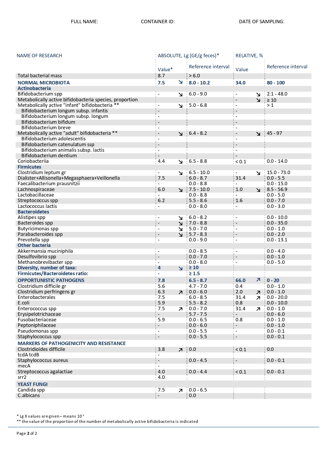 - Page 1 of the report contains brief description of gut microbiota state and a final table with the main assay results.