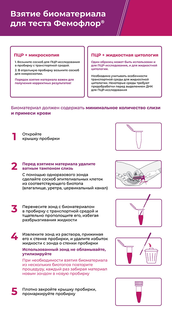 Метод ПЦР в режиме реального времени технически позволяет выполнить комплекс Фемофлор®16 + патогены + HPV Квант-21 из одной пробирки с биоматериалом, полученным из влагалища и цервикального канала. На практике некоторые лаборатории просят собирать биоматериал для выполнения теста Фемофлор®16 и/или одиночных ПЦР-тестов в отдельные пробирки, поэтому целесообразно уточнить вопросы преаналитики перед назначением исследований.