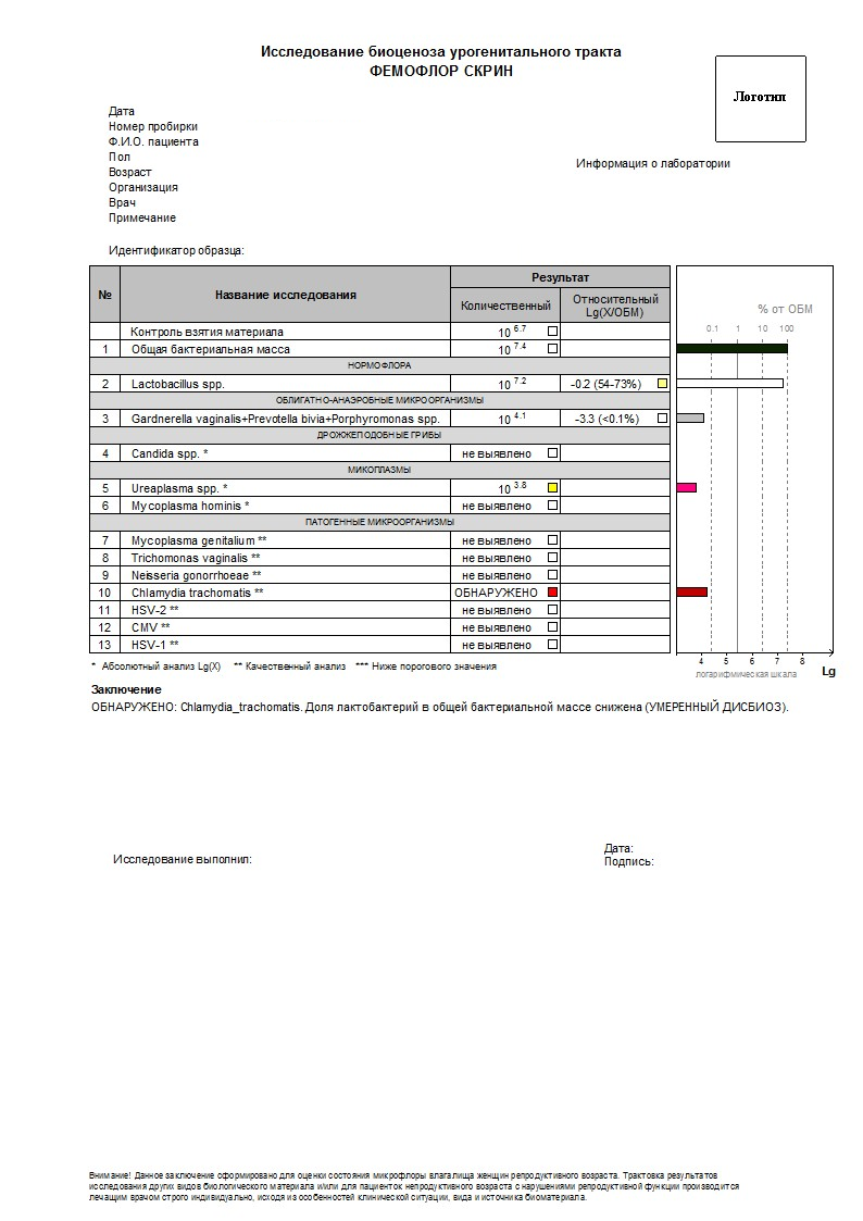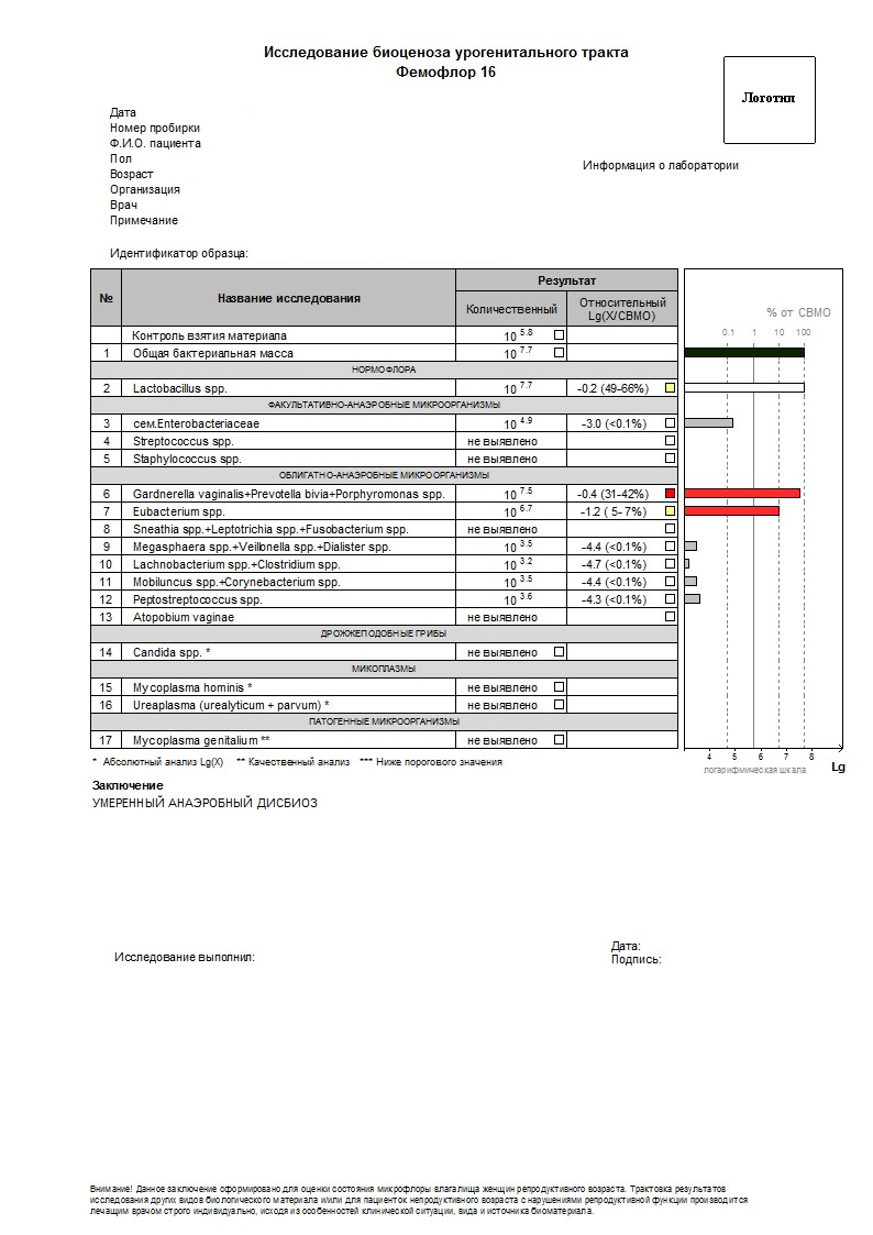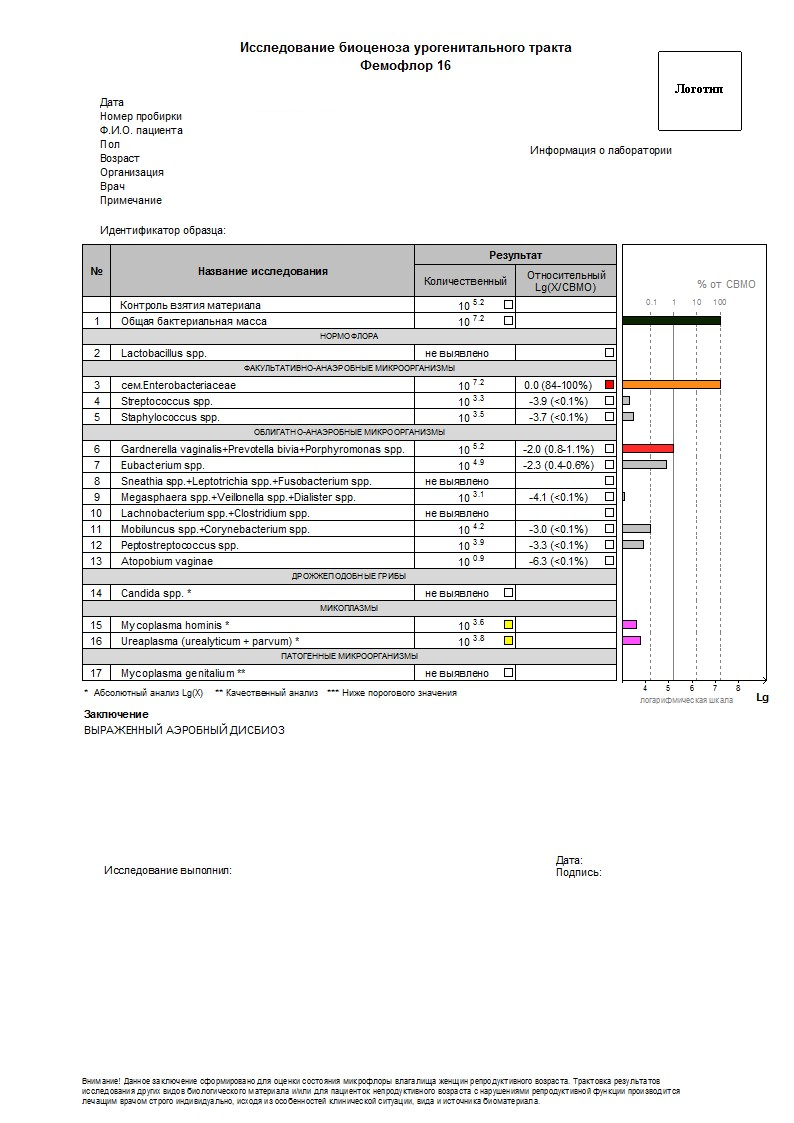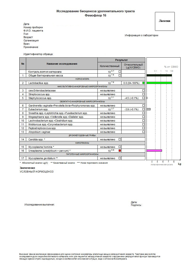 Исследование включает в себя количественную оценку нормофлоры (количества Lactobacillus spp.) и условно-патогенных микроорганизмов по сравнению с общей бактериальной массой, что позволяет определить их клиническую значимость и тип дисбиоза. Также количественно оценивается содержание Ureaplasma spp., Mycoplasma hominis, Candida spp. и облигатных патогенов.