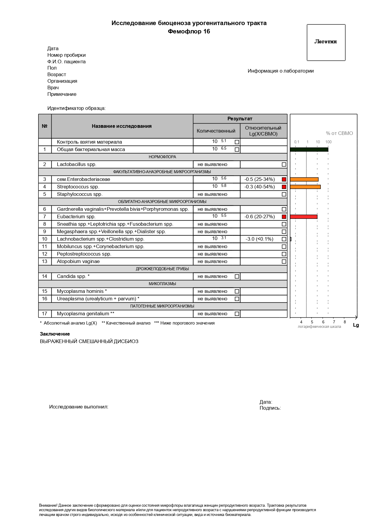 Автоматическая трактовка бланка (система «светофора» в таблице и окраски столбиков на гистограмме) и заключение по результатам исследования Фемофлор® разработаны для женщин, использование этих трактовок при исследовании биоматериала мужчин может привести к ошибочным выводам.